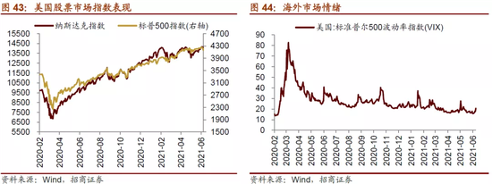 上周VIX指数回升,全周较前期(6月13日)上升4.99点至20.64,市场风险偏好恶化。上周美联储发布利率决议,表明继续维持一定购债规模,尽管政策继续为经济提供强有力的支持,但上调了两大管理利率(超额准备金利率和隔夜逆回购利率),加息预期前移,美股市场下跌,道琼斯指数打破连续涨势下跌3.45%,标普500指数下跌1.91%,纳斯达克指数下跌0.28%。