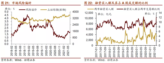 6月14日-6月18日,当周融资买入额为3255.5亿元;截止6月18日,占A股成交额比例为12.1%,较前期上升,投资者交易活跃度增强,股权风险溢价上升。