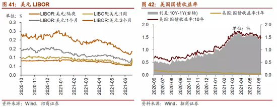 6月14日-6月18日,短端美债收益率上行,长端美债收益率下行,利差缩小。美国1年期国债收益率上行4.0bp至0.09%,10年期国债收益率下行2.0bp至1.45%,利差缩小6.0bp至1.36%,截止6月18日,美元LIBOR均上涨,隔夜LIBOR上升2.51bp,1周LIBOR上升2.65bp,1个月LIBOR上升1.81bp,3个月LIBOR上升1.60bp。