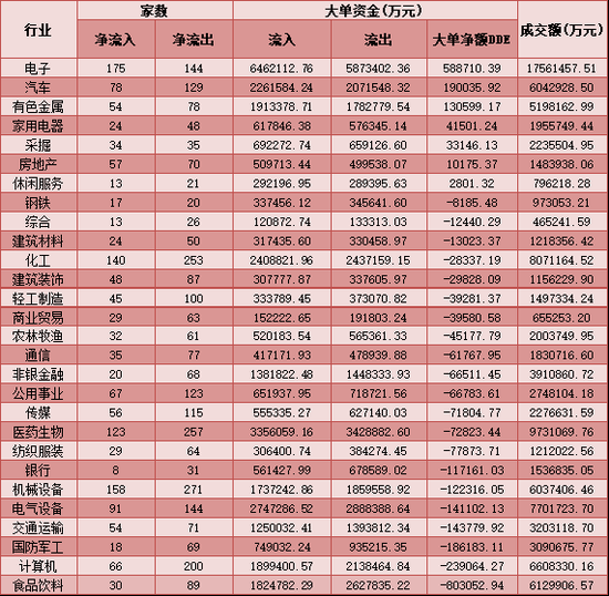 从资金层面看,周三市场呈大单资金净流出态势,为连续第20个交易日净流出,周三DDE大单净额流出达138.96亿元。行业方面,有7类行业呈净流入,前三位分别为:电子(588710.39万元)、汽车(190035.92万元)、有色金属(130599.17万元)。