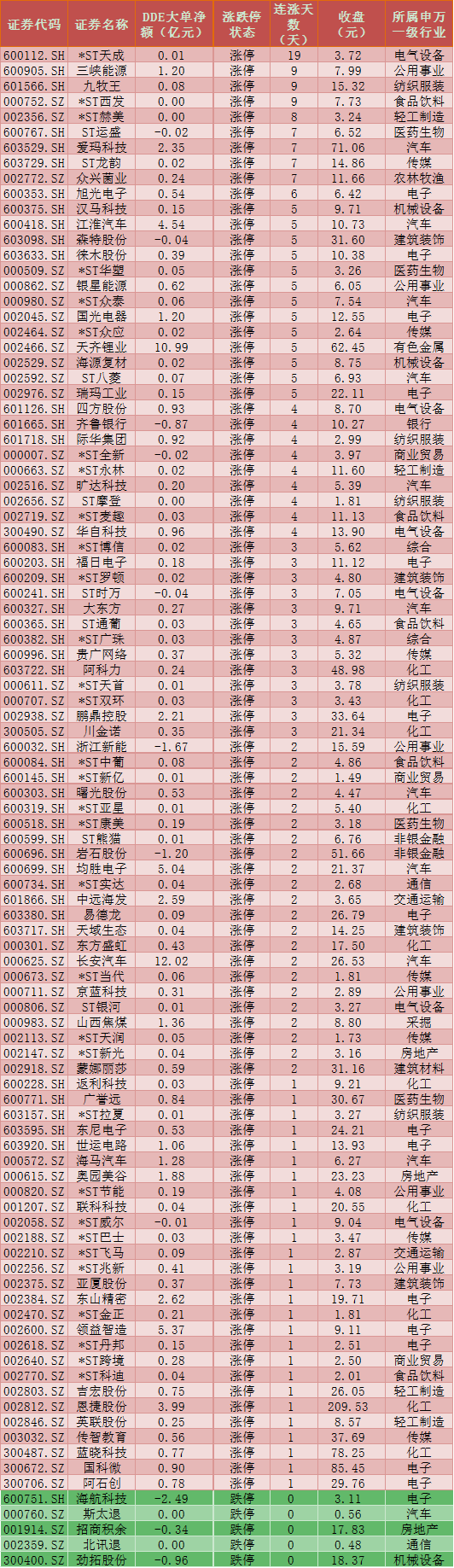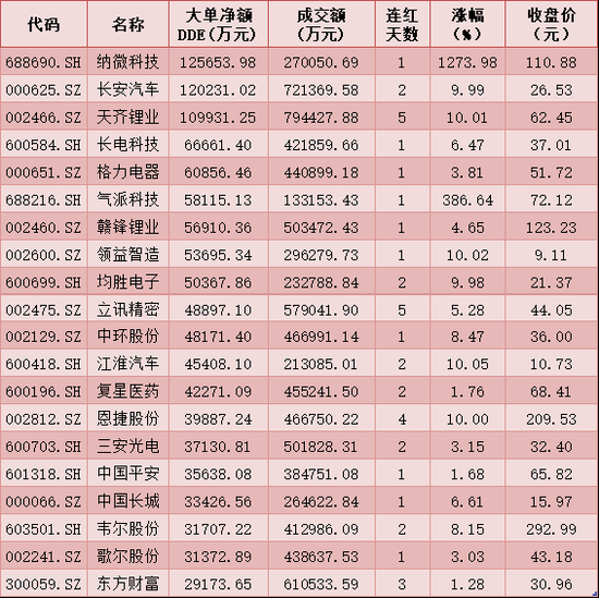 一、周三(6月23日)DDE大单资金净买入TOP20