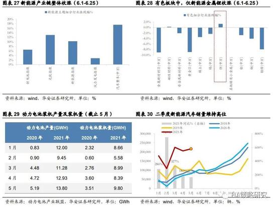 需求扩大逻辑推动,新能源车产业链,锂电和整车景气度确定性更高。6月汽车及电气设备板块表现优异,尤其是近一周在光伏板块的带动下,带动整个板块涨幅达到6.5%。从资金维度来看,新能源也是除半导体外,另一个资金重点加仓的高景气板块,6月北上净买入位列第二。不过整体来看,受到新能源车需求的扩大,新能源链条中仍然是整车和锂电的景气度较高,确定性更强。二季度4、5月新能源汽车销量同比增速分别达到187%和166%,维持高速增长。而光伏的推动更多是在于6月下旬国家能源综合司发布屋顶分布式光伏开发试点的方案通知,要求在党政机关、学校医院等按比例安装,进而催化光伏板块的上行;但是考到此次试点方案并不是新发政策,而是延续现有政策各地进行推动,光伏景气度变化仍有待进一步验证。