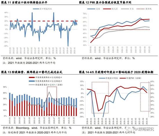 出口方面,5月出口增长放缓但仍远高于疫情前水平,预计后续总体将呈现温和放缓的趋势。5月出口同比增加27.9%,两年复合增长11.1%,较前值下降5.7%,增速放缓明显。展望后续,由于①主要进口国供给、需求端恢复节奏、程度参差不齐,对我国出口或将形成较强的随机扰动。美、日、欧元区供给、需求端的恢复程度以及速度均不相同,个别国家如美国的供给端的进一步恢复可能对我国起抑制作用,而其他国家则是促进作用,因此未来他们恢复的节奏将放大我国出口增长波动。②全球新冠疫情得到控制,全球供需错配将逐步减弱,我国出口也将逐步回归正常。随着全球疫苗接种率的上升,每日新增大幅降低,若去掉印度的新增人数,全球新增人数的第二次高峰将远低于第一次高峰,因此后续供需错配的逐步缓解是大趋势。③防疫物资与进口替代拉动我国出口已成为过去时。2020年4-10月防疫物资出口大幅增长,而4-6月我国对印度的进口替代效应也十分明显,但这些在2020年10月后就基本消退了。④当前暂无亮点产品大幅支撑出口。疫情以来,部分出口产品可能在短时期增速较高,但并不持续。全球疫情的不同阶段对应中国出口产品的结构也在不断改变,但对于那些出口占比大于1%的高占比产品如机电产品、钢铁、纺织服装等,并未出现持续的高增速。因此我们预计年内出口增长在个别时期或有所波动,但总体将呈现温和放缓的趋势。