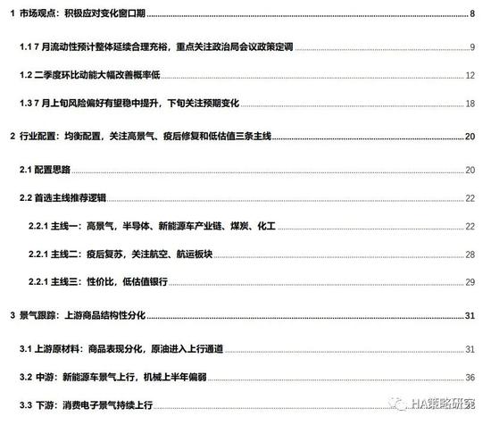 在7月货币政策不会有较大变化,流动性大概率继续维持合理充裕的状态;增长环比动能大幅改善概率较低;以及政治局会议召开在即,以将给予市场风险偏好支撑的情况下,行业配置基调不变,延续均衡思路。并在中报季来临阶段,三条主线重点关注高景气:主线1:高景气,关注半导体、新能源车产业链、以及周期中煤炭、涤纶和化学制品的结构性机会。主线2:疫后修复主线,关注景气度上行的航运和航空板块。主线3:低估值主线,重点关注银行。