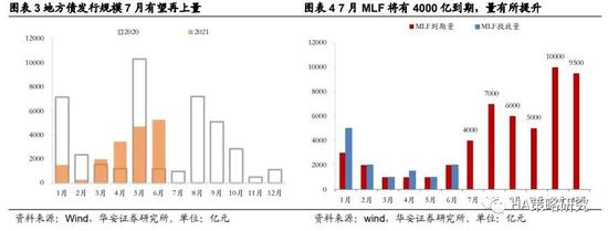 7月资金供需关注4000亿MLF到期和地方债发行上量,关注央行的应对。供给方面,一是受经济仍然较为疲弱的影响,M2同比增速有望维持在8.0%左右。二是较为重要的,MLF将在下半年迎来大规模到期,合计4.15万亿,其中7月份到期4000亿,较上半年大幅增加。我们预计央行7月延续等量等利率续作的概率更大;需求方面,值得重点关注的是上半年地方债发行的进度偏缓、规模较小,但5、6月份已经出现了明显的改善,我们预计7月份地方债发行的量将进一步有所增大,预计在8000亿左右。7月资金供需的量级较上半年将有明显的提升,因此需重点关注央行的应对。