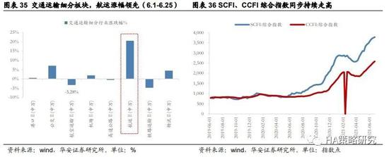 航运运力紧张暂时未有缓解,估值处于低位。6月整个交通运输板块中,航运表现遥遥领先,收涨20.51%。同时价格方面,6月上海出口集装箱指数SCFI和中国出口集装箱指数CCFI分别上涨8.3%和12.8%。从7月来看,预计航运高景气还将延续。一是需求端下半年本身就海运的传统旺季;二是上半年以来集装箱紧张的情况并未有所缓解,包括疫情带来的集装箱供给不足以及此前3月苏伊士运河堵船带来的后遗症,使得包括深圳盐田港近期也面临拥堵的情况。三是价格层面,各航线以及各海运公司都纷纷提价,以SCFI指数为例,6月25日的指数价格是去年同期的近4倍。四是业绩端,随着海运的高景气和价格的抬升,航运上市公司的业绩将会大幅抬升,尤其是在中报季来临阶段,也将会催化航运板块的表现。估值维度来看,当前航运II的估值分位数仅在17.2%,尽管较5月底抬升5.4%,依旧处于低位。