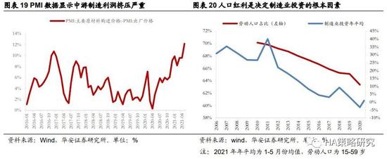 固投方面,5月单月复合增长4.7%,环比下降约1%,整体恢复到疫情前70%左右水平。从具体分项来看,①5月单月房地产复合增速8.96%,增速较上月有所放缓,整体恢复到疫情前80%的水平,后续大概率继续放缓。具体项目来看,房地产销售面积、销售金额两年总比增长9.4%、15.75%,较前值均略有上行,但考虑2019年基数下的5月实际销售面积、金额增长边际均下降明显。展望后续,由于2019年下半年房地产销售面积、金额基数较高,叠加政府对房地产企业的高压监管以及近期恒大相关债项信用等级被列入观察名单等消息,房地产投资继续放缓是大概率事件。②5月基建(含电力)已恢复到疫情前水平(约127%),后续上行空间不大。5月基建投资复合增长3.38%,已经连续两个月下降。后续三季度专项债的提速发行或对基建有拉动效应,但考虑到今年专项债的额度并不发完的可能性、近年来地方政府对于基建重视程度下降以及冬季基建开工率低等问题,预计基建后续上行难度较大。③5月制造业投资改善明显,整体恢复到疫情前48%左右水平。后续短期有望加速修复,但中长期将大概率维持低位。5月当月制造业投资同比增长13.5%,两年平均3.66%,在较高基数下仍然环比上升0.22%,实际改善明显。我们在6月20号的周报《反弹依旧,临近关键节点,波动可能加大》中曾提到,从短期来看,制造业投资有望继续恢复。2015年以来制造业投资的3次回升中,2次与出口的高景气有关,可以看出制造业投资与出口增长呈高度相关,而在当前出口仍然维持高景气的情况下,短期制造业投资继续修复可能性较大。但从中长期来看,制造业投资将保持低位运行。由于①后续出口的温和趋缓将带动制造业投资下滑。②PPI下半年大概率维持相对高位,成本端的高位继续挤压制造业利润。③人口红利与制造业投资2010年以来保持高度相关,而人口红利的进一步消退将促使外资进一步流出、转移工厂等行为,未来制造业投资保持低位运行的概率较大。