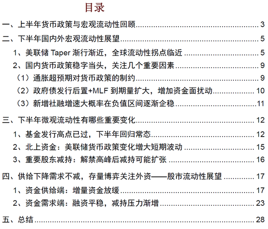 进入下半年,美联储Taper渐行渐近,全球流动性拐点将至。稳字当头的政策基调下,国内货币政策大概率保持稳健,但需要关注通胀超预期上行的可能及政府债发行后置+MLF到期规模扩大对资金面的扰动。微观上,基金发行回归常态,美联储政策政策变化可能通过汇率增大北上资金的波动和不确定性,且解禁高峰往往伴随着减持规模的扩大,下半年股市大概率呈现供需平衡、存量博弈加剧的状态。
