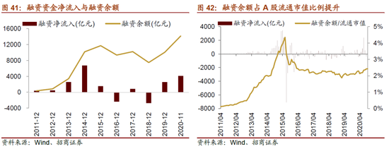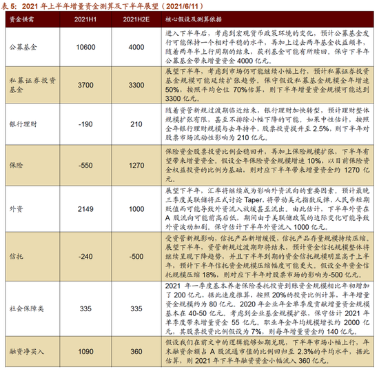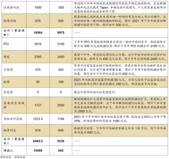 假设我们在前文中的逻辑能够如期兑现,下半年市场小幅上行,年末融资余额占A股流通市值的比例回归至2.3%的平均水平,据此估算,则2021年下半年融资资金小幅流入360亿元。