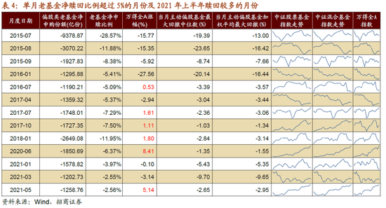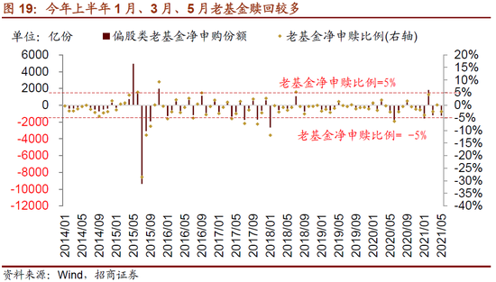 从历史上单月基金净赎回比例超过5%的几个月份来看,市场指数和基金涨跌不一。基金大幅赎回可能出现在市场大幅下跌的时候,如2015年7-9月,2016年1月、2017年4月,其中,2015年7-8月是杠杆资金风险爆发后市场系统性下跌,导致基金大幅赎回;2016年1月是熔断机制下市场快速下跌后导致的赎回。基金大幅赎回也有出现在市场上涨的阶段,如2017年7月、2017年10月、2018年1月和2020年6月,更多属于资金获利了结,不过可以看到,在2017年7月和2018年1月市场出现了比较明显的回撤。概括来说,老基金大幅赎回多发生在市场大幅下跌的月份或者市场上行后出现回撤的月份。