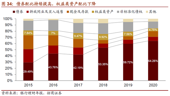 就理财产品的配置结构而言,2020年银行理财继续增配债券资产而减配权益资产。其中债券资产占比达64.26%;相比之下,权益类资产的配比仅4.75%,较2019年下降了2.81%。理财子公司产品投中,投向债券、现金及存款、权益类资产的比例分别为64.54%、6.81%和2.31%,相比全市场理财产品,银行理财子公司对债券和现金分别超配0.28%和0.19%,而权益类资产低配2.44%。这就意味着,目前银行理财子公司对权益类资产的投资仍比较保守,理财子公司对权益资产的配置仍是一个长期的过程。