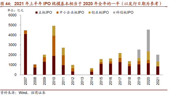 截至2021年6月11日,2021年上半年共有192家公司进行A股IPO发行,对应融资规模2016亿元,基本相当于2020年全年IPO规模的一半;相比去年同期提速。主板、创业板、科创板募资规模分别849亿元、494亿元、673亿元。