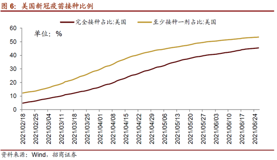 第二,美国疫苗接种有序推进。从美国疫苗接种进度来看,美国新冠疫苗至少一次接种比例达到53.5%,完全接种比例是45.5%。6月以来美国疫苗接种速度有所放缓,按照目前的接种速度推算,8月前后美国接种比例可能达到目标,将为美联储收紧货币政策进一步创造条件。