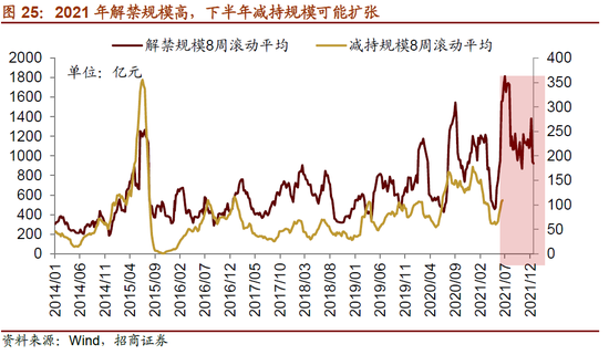 2021年全年解禁规模达到5.5万亿元,上半年和下半年基本各半。其中上半年的解禁规模大量集中在6月。以8周滚动平均解禁规模和减持规模来看,两者相关性高,在下半年解禁规模仍保持高位的情况下,叠加上半年的解禁高峰,预计下半年重要股东减持规模可能扩张。