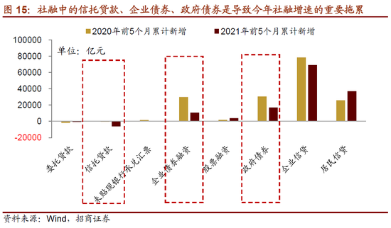 5月社融存量规模增速已经降至11%,如果按照全年GDP名义增速9%-10%计算,那么社融增速与GDP增速的差值已经明显收窄,进一步收窄空间比较小。从结构上来看,今年以来,非标中的信托贷款、企业债券融资以及政府债券是造成社融增速快速下滑的重要原因,信托贷款前5个月累计减少6192亿元;新增企业债券同比减少63.6%;新增政府债券同比减少44%。相比之下,企业信贷少增幅度不大,居民信贷同比增加44%。这主要与国内信贷政策和环境变化有关:1)2021年是资管新规过渡期最后一年,非标持续压缩,且年初的信托监管工作会议明确2021年将继续压降信托通道业务规模及违规融资类业务规模;2)房地产企业融资面临“三道红线”的政策约束;3)信用违约事件导致信用风险偏好下降,信用债发行受阻;4)政府债券发行明显滞后,去年高基数下政府债券融资同比下滑明显。