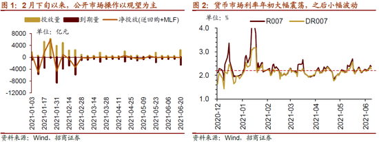 2020年在信用违约事件频发的情况下,央行在四季度连续超额续作MLF,投放中长期流动性,以维护市场流动性稳定。跨年后,2021年初市场流动性延续超预期宽松,DR007明显低于7天逆回购利率。为了对市场的政策宽松预期进行纠偏,稳杠杆、稳地产,央行开始连续回收市场流动性,防止资产泡沫化,由此1月后半月货币市场利率大幅上行。
