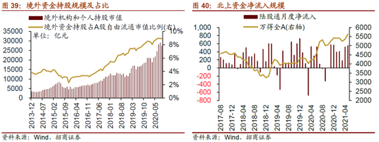 2021年以来,北上资金大幅流入,尤其在人民币快速升值的4月和5月,北上资金明显放量流入。截至6月11日,北上资金年内累计净流入2149亿元。截至2021年3月末,全部外资持A股规模3.36万亿元,占A股流通市值的比例为5.34%。