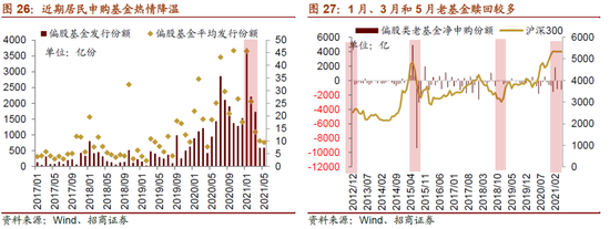 1)基金发行回归常态,警惕赎回。过去两年公募基金收益可观,不过市场回撤导致基民风险偏好下降叠加市场赚钱效应减弱,2021年二季度以来公募基金发行已经明显放缓,未来大概率继续保持一个常态水平。同时也需要关注潮水退去后,基民可能在落袋为安的诉求下赎回基金导致资金流出。
