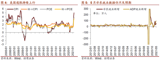 美国5月核心PCE指数达到3.39%,为近30年最高水平;5月CPI达到5%。持续上行的通胀引起美联储关注,6月议息会议上美联储已经上调全年的通胀预期且鲍威尔表示“供给瓶颈、招聘困难和其他制约因素可能继续限制供给得以调整的速度,提高了通货膨胀可能变成比我们预期的更高和更持久的可能性”,由此来看,通胀成为影响美联储货币政策越发重要的因素。