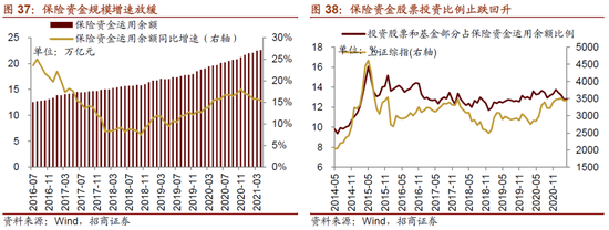 今年以来,保险资金规模延续扩张,不过扩张速度逐步放缓,权益配置比例下滑。截至2021年4月,保险资金运用余额22.6万亿元,同比增速15.4%;较去年年末增长了4.33%。其中投资股票和基金的比例在一季度持续下降至12.76%,4月企稳回升至12.82%。据此估算,2021年上半年保险机构对股票市场流动性的影响约为-550亿元。