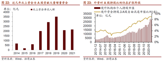2017年以来,北上资金已经成为A股的重要增量资金,每年贡献的增量资金规模都在2000亿元以上。与此同时,外资持A股规模及其占比也在持续扩大。截至2021年3月末,全部外资持A股规模3.36万亿元,占A股流通市值的比例为5.34%;其中北上资金持股2.36万亿,占全部外资持股的70.2%。