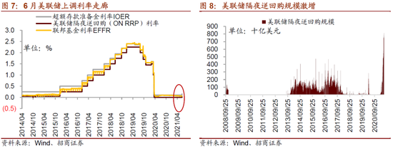 最近几周美联储隔夜逆回购规模激增,5月25日以来单日规模均已超过4000亿美元,其中6月17日和6月18日已经超过7000亿美元,为历史单日最大规模。反映出当前美国货币市场流动性过剩,联邦基金利率保持在0.06%的历史低位。为了应对这种情况,6月议息会议上美联储将利率走廊上下限的超额准备金利率和隔夜逆回购利率均上调5bp,以防止货币市场利率进一步下行。