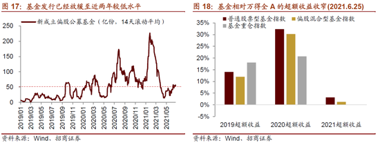 市场回撤导致基民风险偏好下降叠加市场赚钱效应减弱,2021年二季度以来公募基金发行已经明显放缓。一方面,年初市场的下跌尤其公募基金收益的大幅回撤导致基民风险偏好下降,申购热情不足;另一方面,今年上半年大多数阶段市场呈现结构性行情,市场赚钱效应减弱,偏股类公募基金相比市场指数的超额收益率在上半年明显收窄,其中普通股票型基金指数相对万得全A的超额收益从2019年的32.4%收窄至上半年的3.16%;基金重仓指数上半年小幅跑输万得全A指数0.05%。