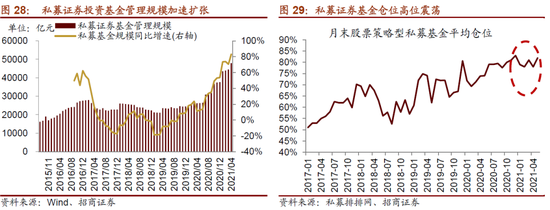2021年以来,私募基金规模增速持续高速扩张,即使在上半年市场调整明显的阶段依然保持扩张,显示高净值人群入市热情仍比较高涨。截至4月末,私募证券投资基金管理规模4.8万亿,相比年初增加1万亿元,增长了27.5%。另外从仓位来看,2021年以来私募基金平均仓位持续高位震荡,基本保持在80%左右的高位。据此估算,私募基金前上半年贡献增量资金规模约3700亿元。