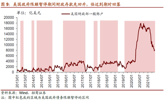 究其原因,美联储QE释放了大量的流动性,且目前仍保持每月购买1200亿美元(800亿国债+400亿MBS)债券。此外,美国财政部存款账户规模骤降也是导致目前美国流动性泛滥的重要原因。一方面,美国经济刺激计划下,财政支出增加,向市场投放流动性。另一方面,美国政府债务限额暂停临近到期(7月31日),财政部存款账户规模受限压降,导致存款机构准备金规模增加。截止6月16日,美国财政部一般账户余额近7651亿元,相比年初下降近53%,导致存款机构准备金大幅增加,而美国财政债务限额暂停到期后也即8月开始,当前超宽松的流动性环境预计将有所收敛。