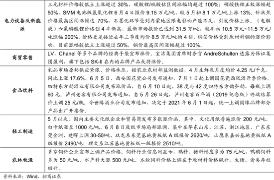 部分中下游行业能够在通胀上行期实现盈利水平的逆势上行,即面临通胀持续上行时,可以通过产品结构调整、提前锁定上游供应商供货价格、调升产品价格、费用缩减、强议价能力等多个方式来减轻通胀带来的负面影响,一方面,产品总量扩张可以降低单位成本或单位费用,从能提升净利率水平;另一方面,议价能力强的行业会采用提价的方式来应对原材料价格上行的压力。近期已有多个行业出现提价行为,本章节将会从两个维度来对此进行分析,从提价行为来预判哪些行业具有业绩超预期改善的可能。