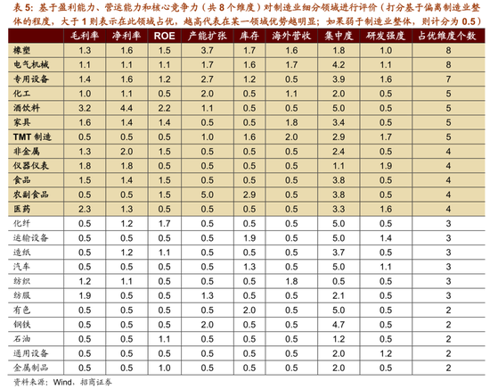 本章节构建了八维度的财务综合评价体系,指标包括毛利率、净利率、ROE、产能周期、库存周期、海外营收、集中度、研发强度等。将A股整体制造业作为参考标准,测评各细分行业不同维度下财务指标大小占优情况。