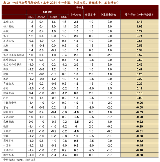 总体评分最高的行业依次为基础化工、轻工制造、机械、电子、石油石化、建材、钢铁、电力设备及新能源等。