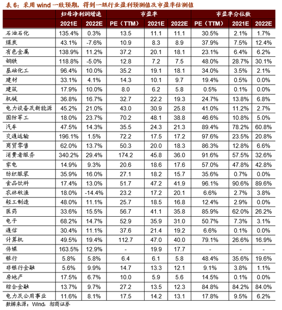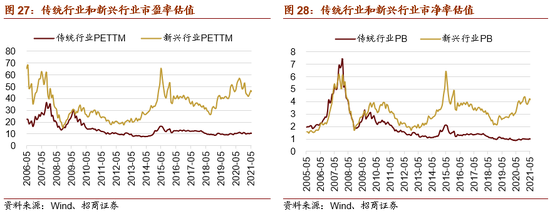 第一,美联储 6 月议息会议上调了超额准备金利率和隔夜逆回购利率,维持目前的联邦基金利率和购债规模。由于市场流动性较为宽裕、美国通胀水平持续攀升以及疫苗接种率上行,美联储年内启动 Taper 的概率正在增大;国内信用收缩环境延续,社融存量增速继续回落;这对于前期涨幅较大且估值处于相对高位的新兴产业估值扩张带来较大的抑制作用。第二,上游资源品板块利润仍处于快速释放阶段,预计中报及 2021 年全年盈利均保持不错的增长;同时银行板块中报业绩增长也具有较强的保障性。传统行业盈利持续修复也对估值提升带来一定的正向驱动。第三,由于新兴行业中集中了较多业绩增长较快且景气度较好的领域,如新能源汽车及其中上游、地产后周期消费、电子等信息科技板块等,这些领域长期发展空间较为广阔且具有较高的资金青睐度,因此新兴行业估值将会长期明显高于传统行业的估值水平。