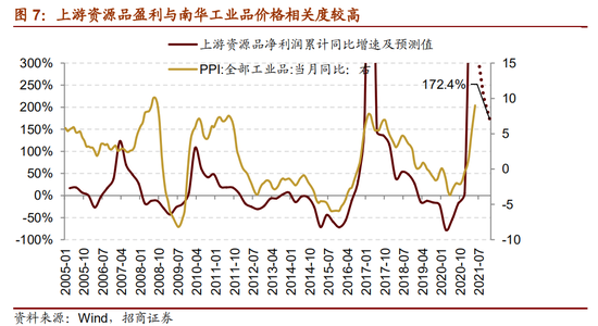 上游资源品主要以采掘、能源以及原材料加工为主,业绩表现常常与大宗商品价格具有较高的相关度,2005年以来上游资源品利润变动与南华工业品价格变动几乎保持同步变化趋势,但由于企业在经营过程中会使用资产杠杆从而放大经营业绩,因此资源品板块利润变化率往往要高于工业品价格端的变化幅度。