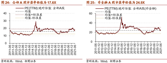 目前全部 A 股市盈率估值为 17.6X,处于历史估值均值附近稍高水平,相比 2020 年估值中枢略有下降;同时年初部分估值处于历史高位且机构集中持仓板块的估值已经出现明显回落。目前非金融板块估值缓慢回落至 24.9X,回落至历史均值水平附近。
