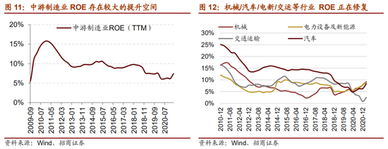 展望2021年下半年至2022年初,非金融及两油ROE将会处于持续改善通道中,未来一段时间内ROE将会继续快速改善,2021年末其改善幅度可能会放缓。从历史数据来看,A股ROE往往在净利润增速达到顶峰之后的2-3个季度达到顶点,即ROE的上行期相比净利润增速的上行期更长一些。本文第一部分已经对于A股盈利周期做出判断,即2021年上半年将会是净利润增速上行期的高点,预计企业ROE将会在2021年末或2022年上半年到本轮高点,随后高位震荡之后进入下行通道。