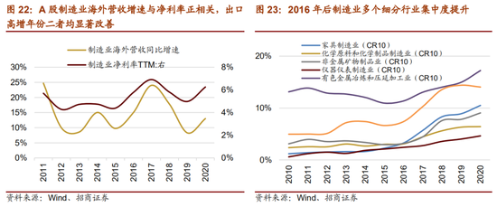 近期A股制造业在海外业务扩张、行业集中度和研发强度方面也取得了非常明显的进步。中国制造业增加值在全球范围内领先,同时A股制造业海外营收规模持续扩张,且出口规模增速与净利率具有较强的正相关性;由于2021年A股制造业出口出口有望延续扩张态势,海外营收占比可能会进一步提升。受益于传统制造业产能过剩问题得到解决、行业准入门槛提高以及规模效应下龙头企业议价能力提升,过去十年制造业中绝大多数行业集中度出现不同程度提升。研发强度方面,A股制造业研发投入占总营收的比例已经快速提升至3.63%(截至2020年报)。A股制造业研发强度相对较高,同时研发费用投入的增速连续两年保持在10%以上。