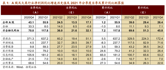 业绩测算:2021 年下半年 A 股盈利增长将会逐渐放缓,2021 年全年 A 股盈利增速呈现前高后低的趋势。预计全部 A 股/非金融 A 股上市公司 2021 年累计业绩增速测算值为 26.4%/45.8%。本轮盈利下行周期将会持续至 2022 年,即 2021 年上半年至 2022年整体 A 股累计盈利增速将会呈现“ヘ”走势。