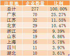 从注册地来看,广东的待审企业最多,共有70家,占比为25.27%。另外有7个地区待审的企业数量达到两位数,它们分别是江苏32家、北京29家、浙江26家、山东19家、上海16家、四川11家、湖北10家。