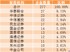 保荐机构方面,IPO日报初步统计(两家券商保荐一家企业按0.5计算),针对创业板待审企业,目前有10家券商的保荐数量达到两位数,分别是华泰联合27家、中信证券23家、中信建投22家、民生证券17家、国金证券14家、国泰君安13家、海通证券12家、国信证券11家、东兴证券和中金公司均为10家。