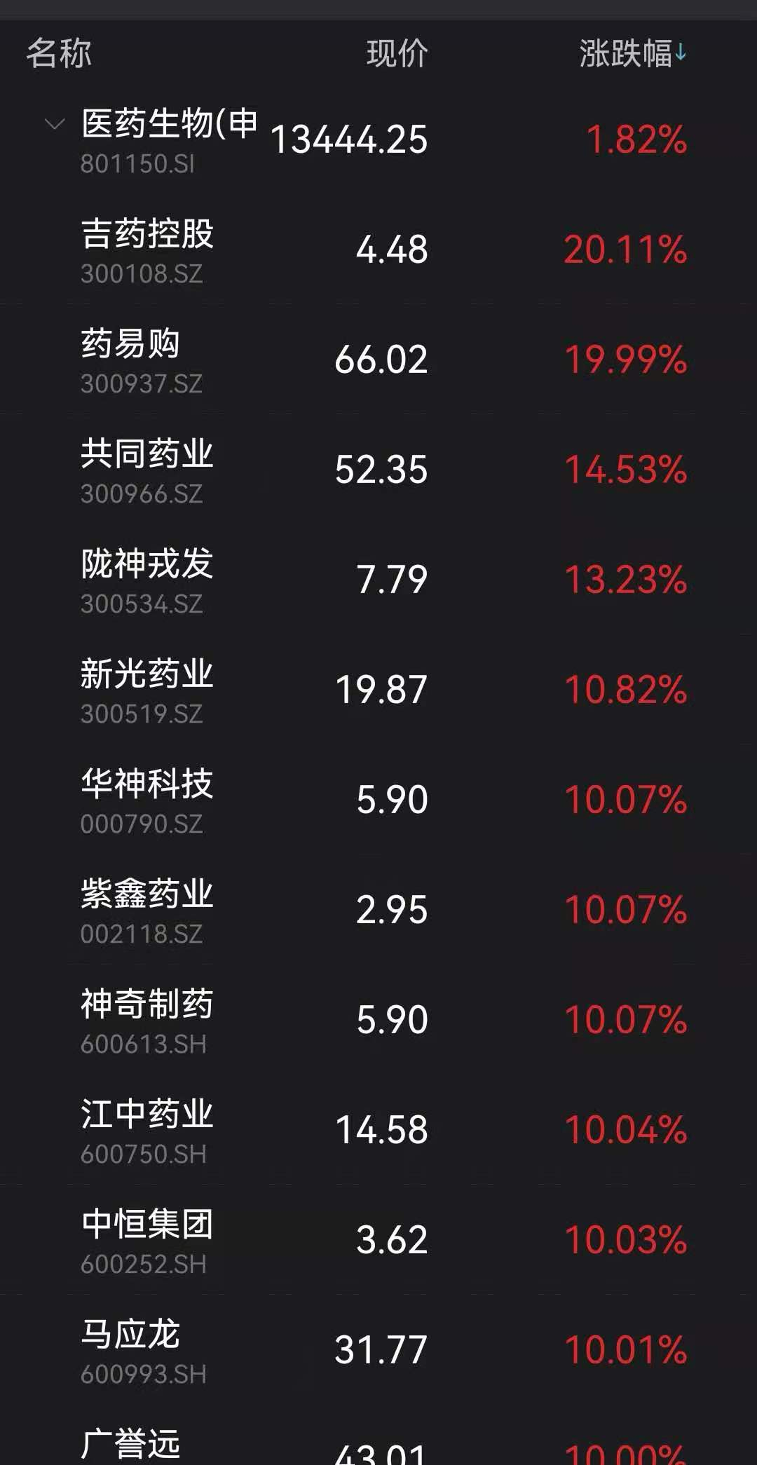 7月1日上午,医药股表现活跃,吉药控股(维权)、药易购、紫鑫药业、江中药业、马应龙、中恒集团等多股涨停,共同药业、陇神戎发、新光药业等涨幅超过10%。