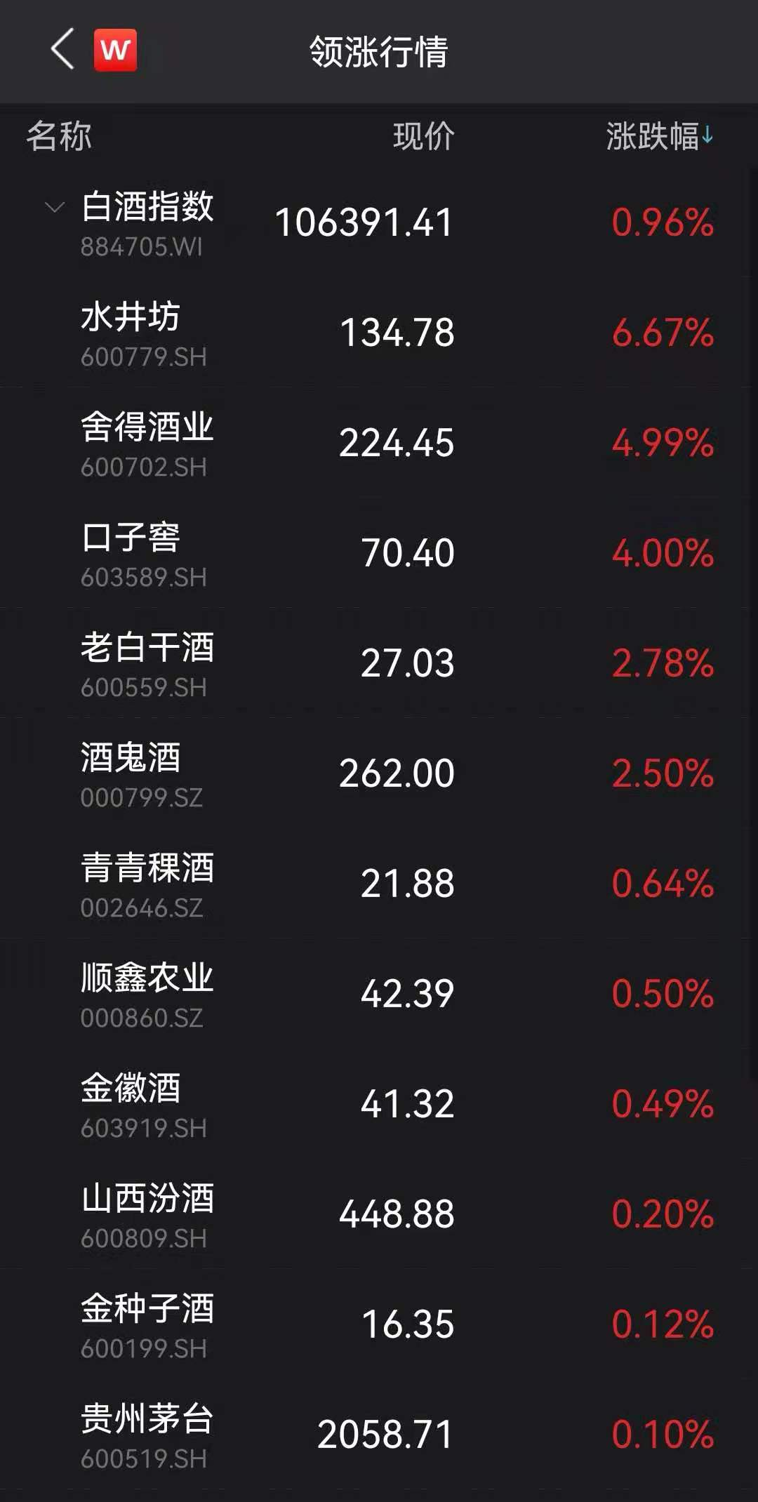 白酒股盘中崛起,水井坊盘中一度冲击涨停,截至上午收盘上涨超6%;舍得酒业(维权)涨近5%,口子窖、老白干酒、酒鬼酒等涨幅也超过2%,贵州茅台拉升翻红。