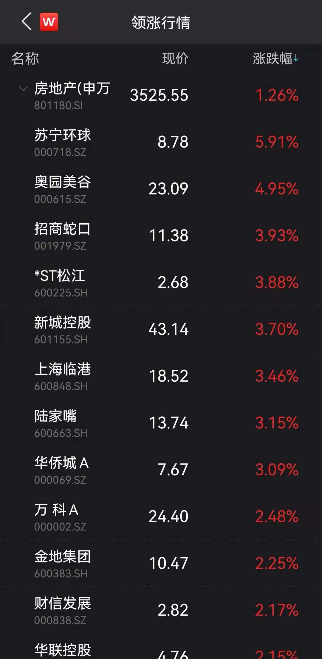 盘面上,房地产板块、银行板块表现亮眼,申万一级房地产行业指数半日涨超1%。其中房地产板块中,苏宁环球涨超5%,招商蛇口、奥园美谷、*ST松江、华侨城A、新城控股等涨超3%,万科A、金地集团等也涨幅居前。