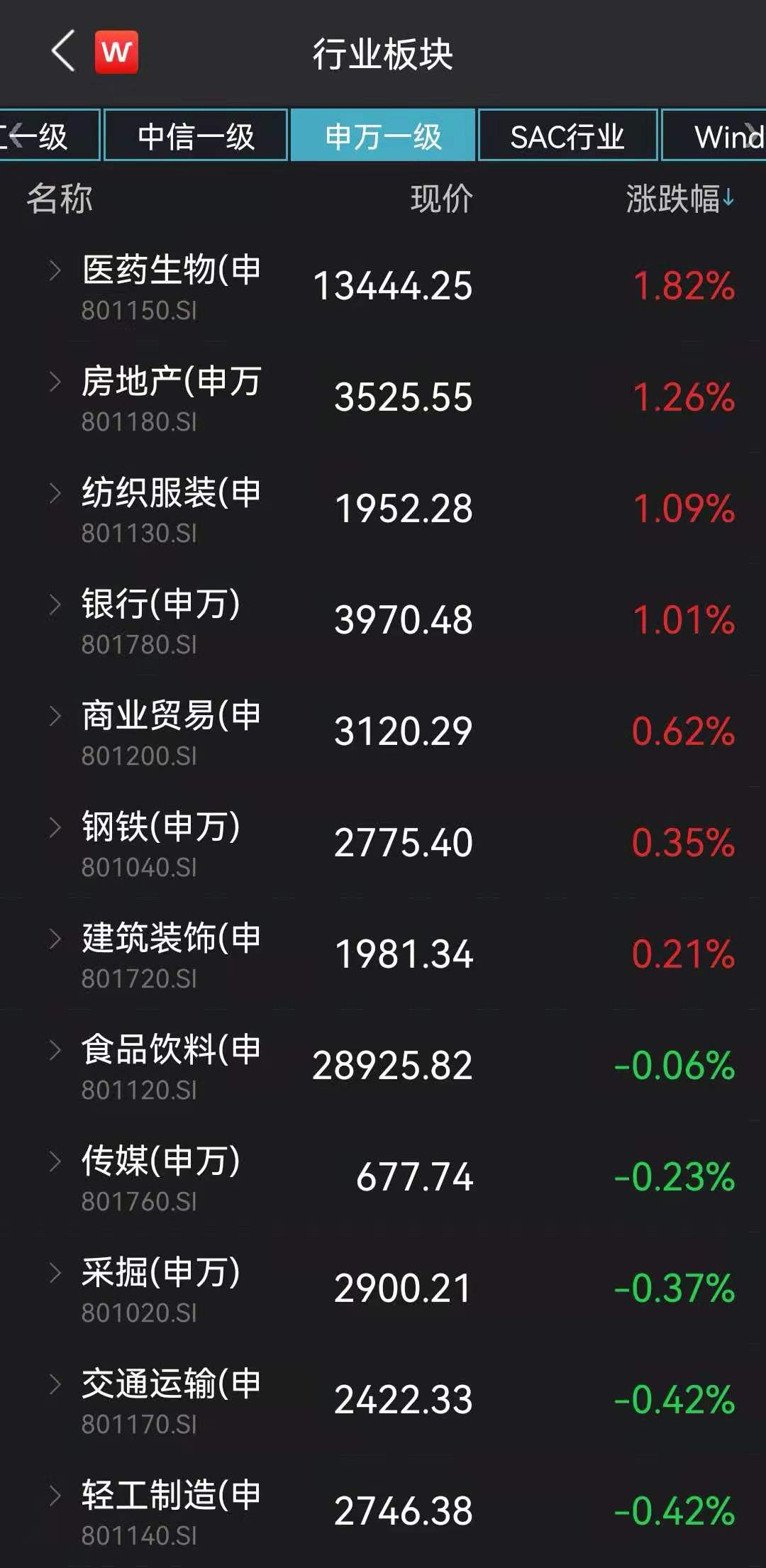 板块方面,医药生物板块表现突出,房地产板块、纺织服装板块涨幅居前;概念板块中,上海自贸区板块午间收盘前异动。