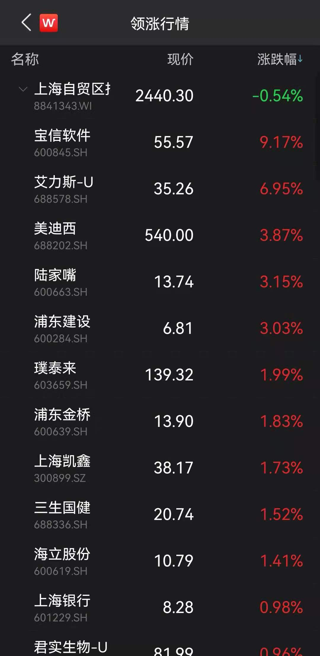 概念板块中,上海自贸区板块午间收盘前异动,宝信软件涨超9%,上海临港涨超3%,陆家嘴、浦东建设、浦东金桥直线翻红走高。