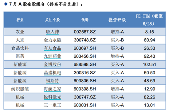 7月,华金证券推荐的金股为:唐人神、金力永磁、有友食品、九洲药业、金博股份、晶盛机电、福斯特、海澜之家、锐科激光、三一重工。