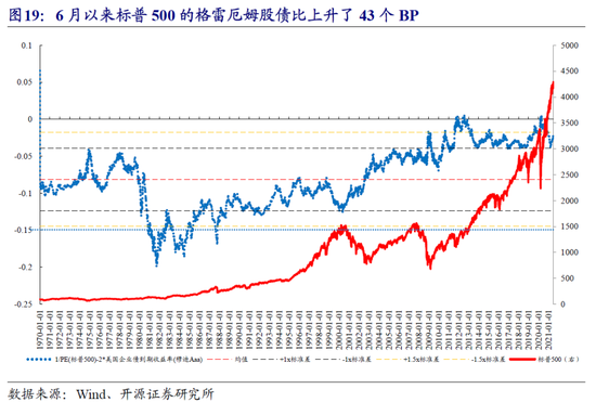 A股和美股相对于AAA企业债的性价比出现了分化:6月万得全A的格雷厄姆股债比下降了11个BP(股票相对于AAA企业债性价比下降),而标普500的格雷厄姆股债比上升了43个BP(股票相对于AAA企业债性价比上升)。