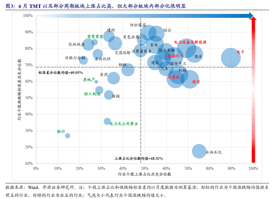 (2)从动态的视角来看,6月相较于5月而言,上涨个股占比分位数除电子、消费者服务明显上升以外,其余行业均低于上期水平。其中,非银金融、商贸零售、医药、银行、房地产、食品饮料等行业下降最为显著。