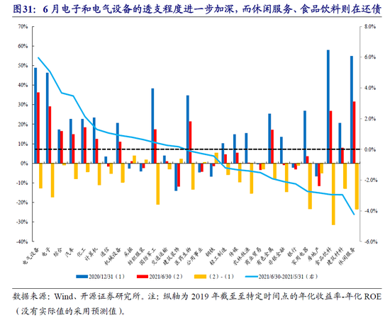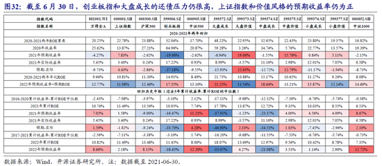 从估值和盈利的匹配度来看,以大盘成长和创业板指为代表的成长风格指数仍在继续透支未来,透支水平甚至已经超过了2月初时的水平,而价值风格仍在折价,性价比凸显。我们计算了各个指数与行业的收益率与ROE之间的透支程度,截至2021-06-30,虽然所有指数相对于2020年而言均在还债,但从6月当月的表现来看创业板指、大盘成长等指数仍在继续透支未来;而对于上证指数、价值风格指数而言它们的收益率向ROE修复的进程中断了,修复的空间继续拉大。具体到各个行业,6月电子和电气设备的透支程度继续加深,而休闲服务和食品饮料对ROE的透支则有所缓解。在收益率向ROE回归的框架下,我们考虑如下两种情景:(1)2020-2021两年收益率向ROE回归;(2)2021累计年化收益率与累计年化ROE之差回归到过去五年中枢。则无论在哪种情景下,创业板指以及大盘成长的还债压力很大;而上证指数和价值风格指数的预期收益率排名靠前,这意味着价值风格的风险收益率比更好,性价比进一步凸显。