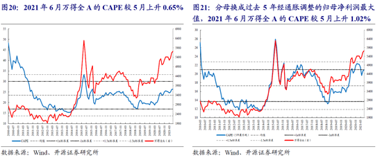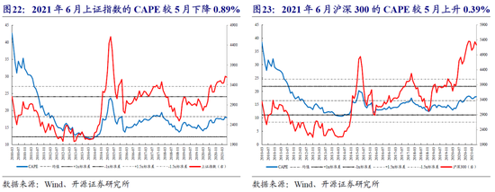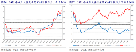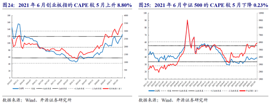 6月A股整体的CAPE较上个月小幅上行,不同宽基/风格指数的CAPE表现有所分化。创业板指和大盘成长的CAPE较5月分别反弹8.80%和2.74%,纷纷创下历史新高;而上证综指和大盘价值的CAPE则分别下行0.89%和2.66%。